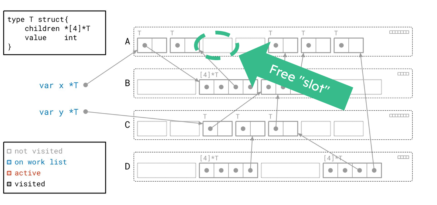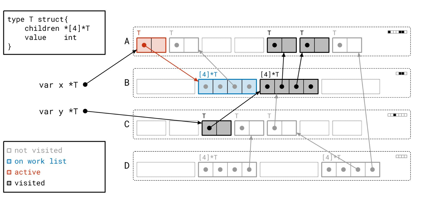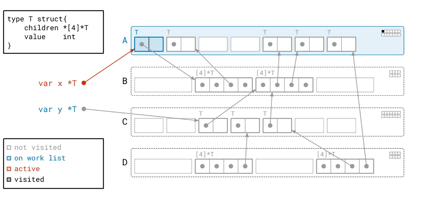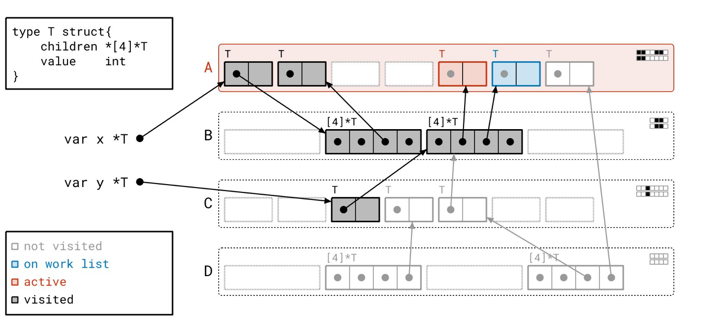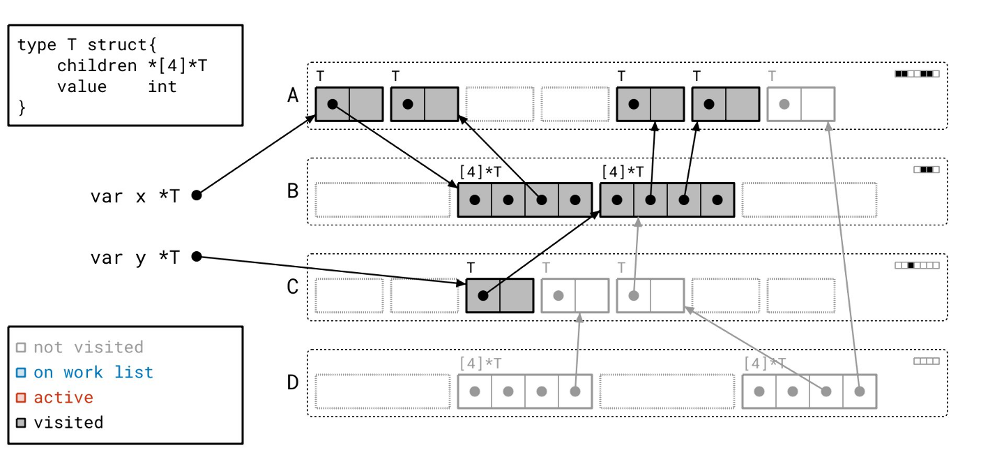 For example, this algorithm is, in practice, executed concurrently with your regular Go code. Walking a graph that’s mutating underneath you brings challenges. We also parallelize this algorithm, which is a detail that’ll come up again later.