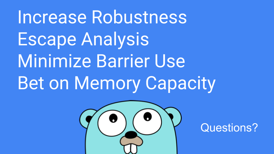 We also had escape analysis and it was getting better and better. Remember the value-oriented stuff we were talking about? Instead of passing a pointer to a function we would pass the actual value. Because we were passing a value, escape analysis would only have to do intraprocedural escape analysis and not interprocedural analysis.