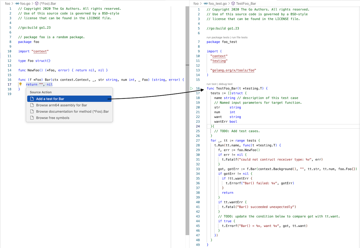 workspace/executeCommandrequest; however, no current code lenses are transformations of Go syntax. - Most transformations are defined as code actions.