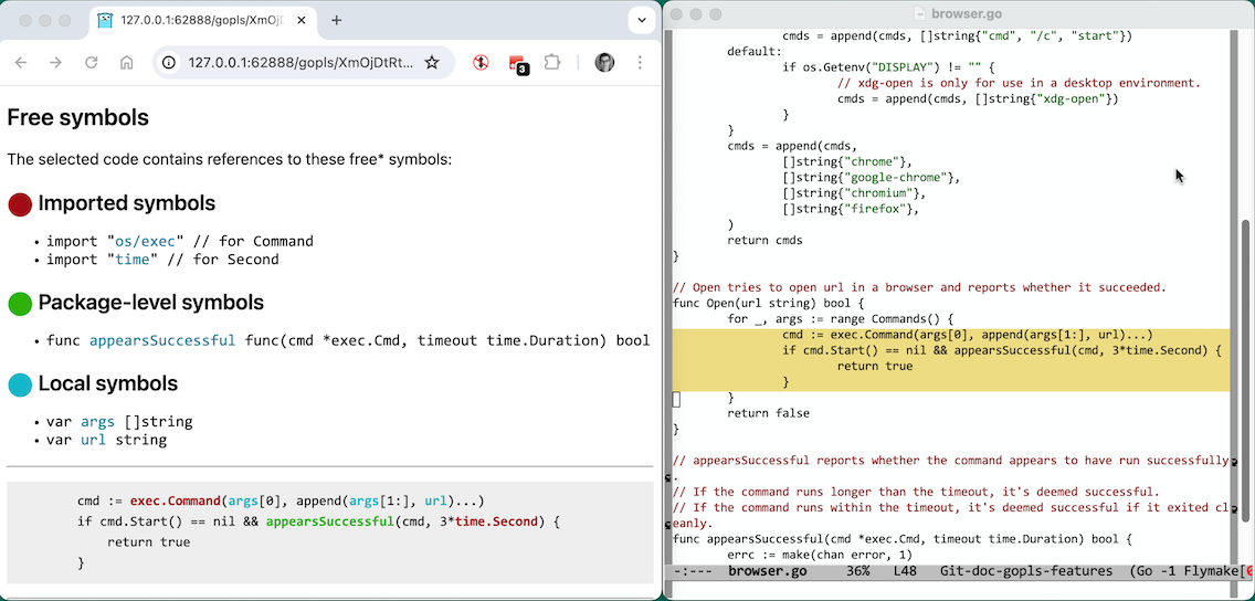 Gopls offers another web-based code action, “Browse free symbols”, which displays the free symbols referenced by the selected code.