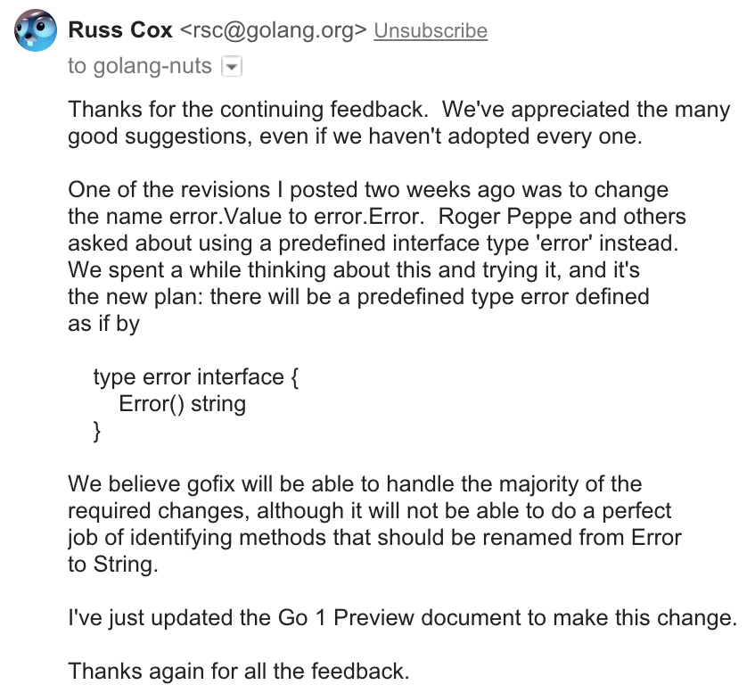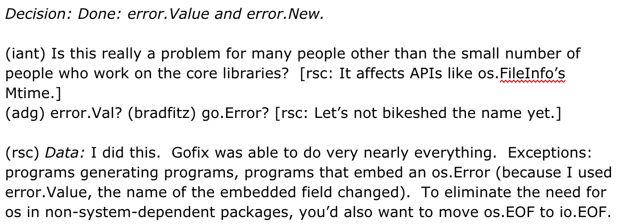 }Before the Go 1 meeting, Russ raised the issue in the design document: