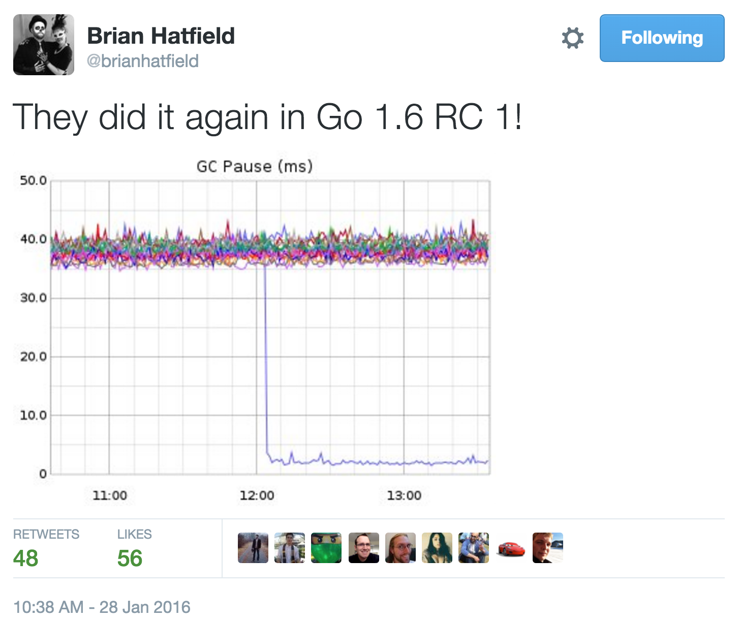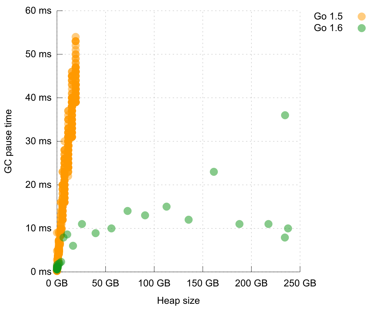 At QCon SF in November Rick Hudson gave an updated presentation which showed this comparison of Go 1.5 to the upcoming Go 1.6
